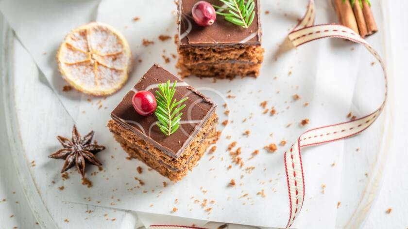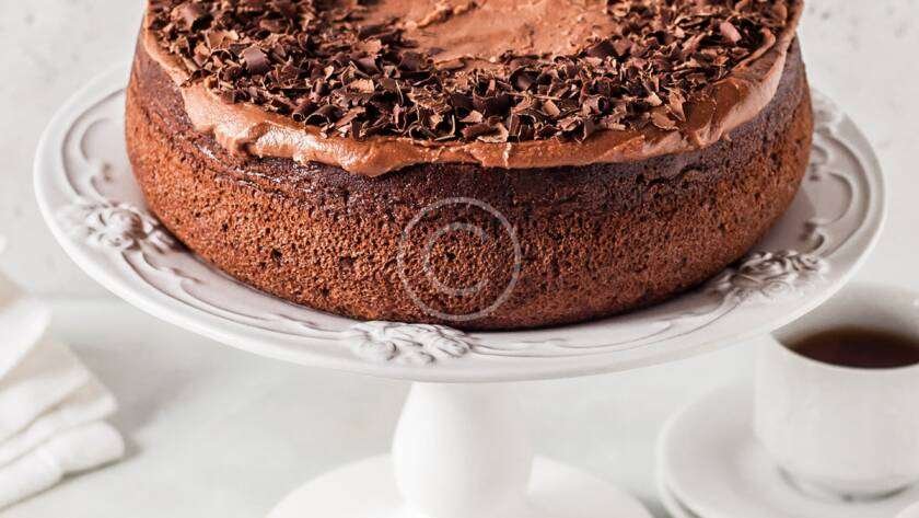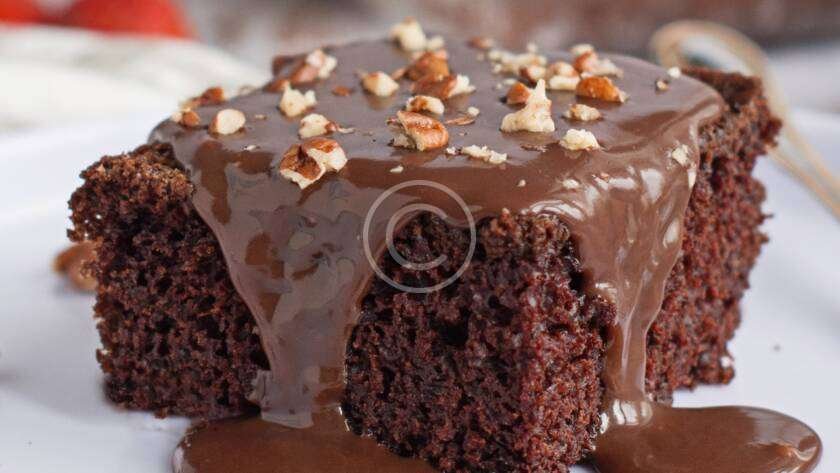 Soft sponge cake with dark chocolate topping and nuts